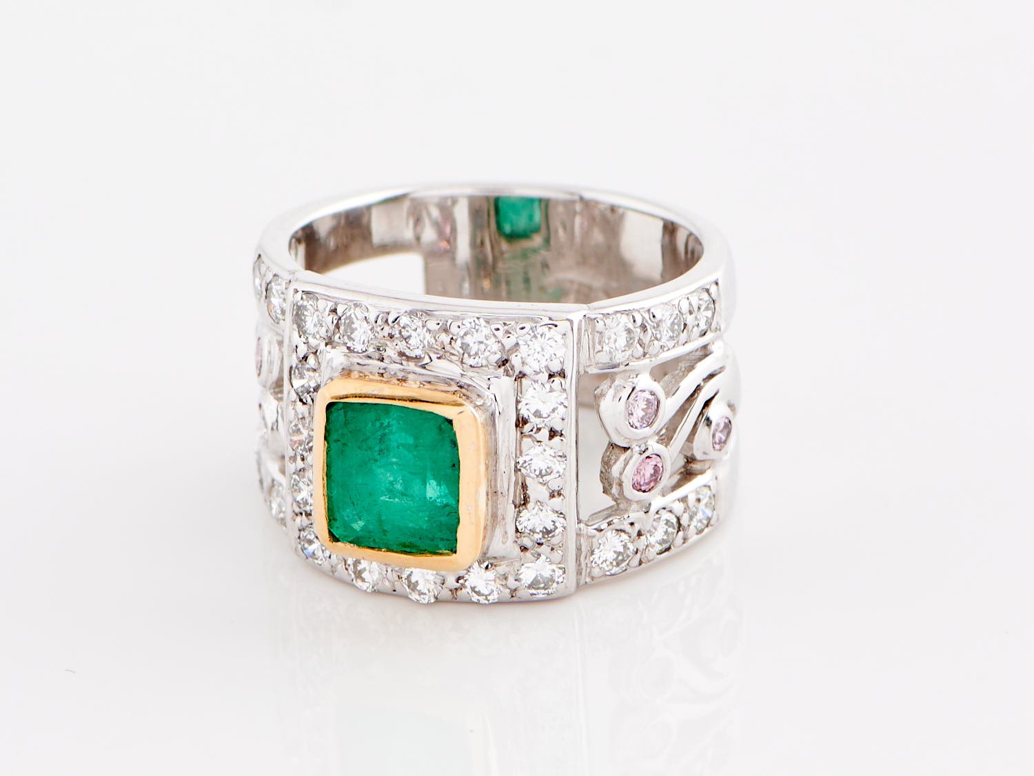 AN EMERALD, PINK DIAMOND AND DIAMOND SET RING IN 18CT WHITE GOLD AND 9CT GOLD, THE EMERALD TOTALLING APPROXIMATELY 1.20CTS, THE SIX PINK DIAMONDS TOTALLING APPROXIMATELY 0.10CTS, THE DIAMONDS TOTALLING APPROXIMATELY 0.60CTS, RING SIZE L, WEIGHT 8.2GMS, WITH VALUATION