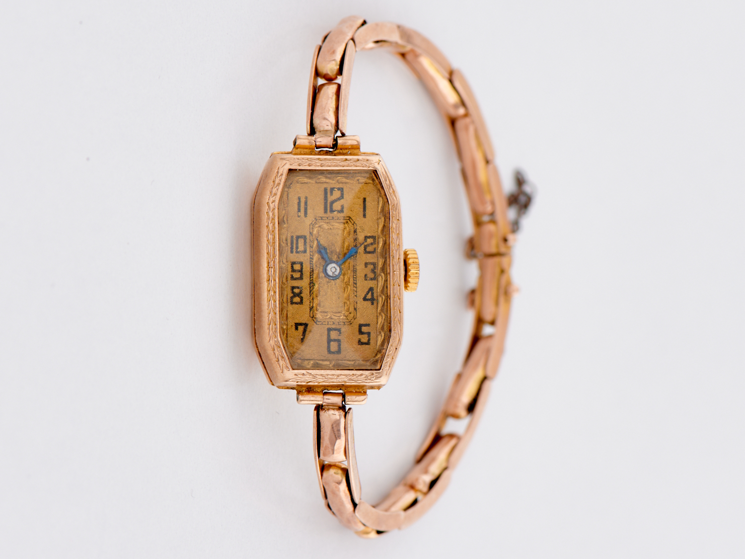 AN ANTIQUE WATCH IN 9CT GOLD, 27 X 16MM, 17.5GMS