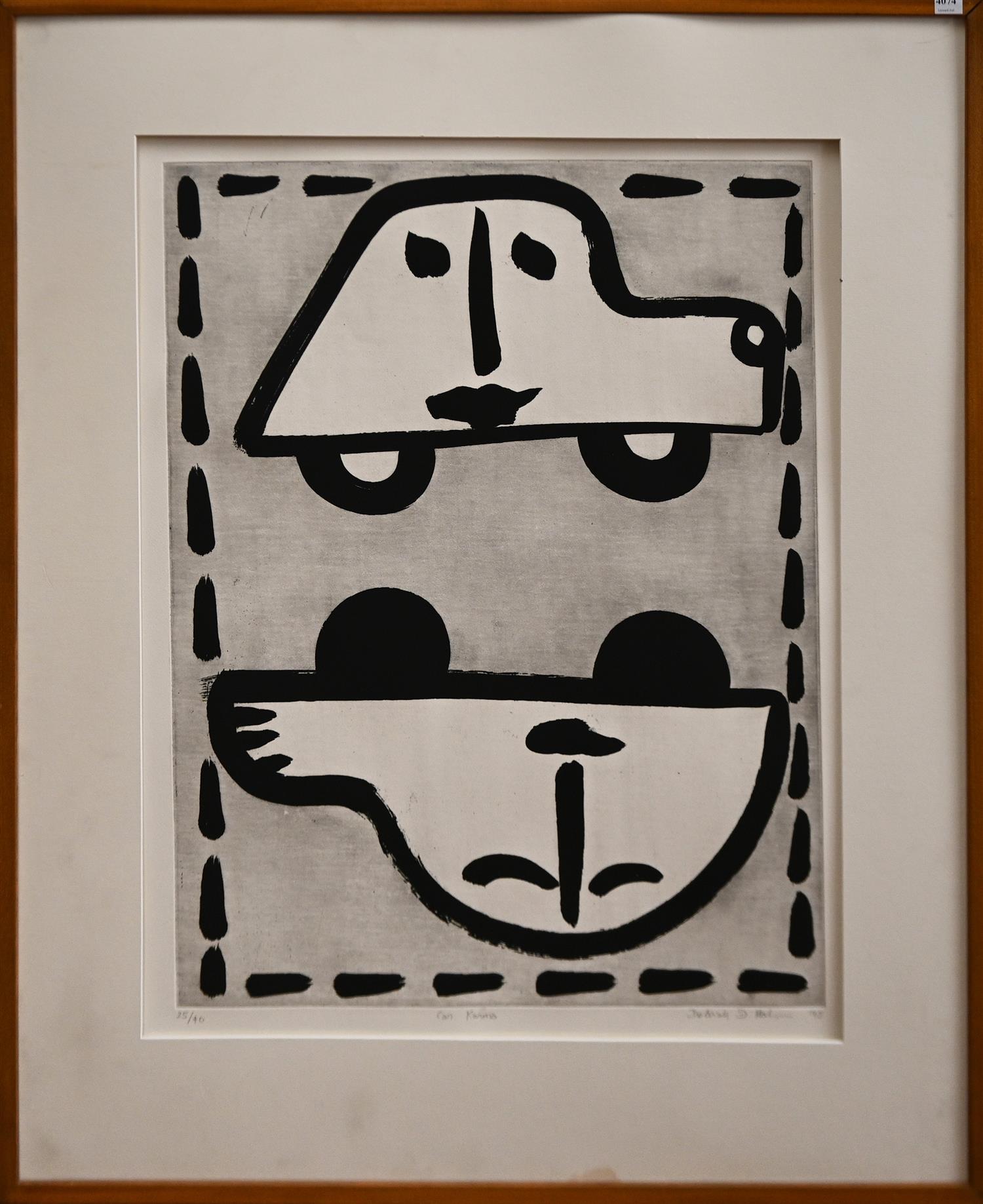 Work is framed, without glass. Print has slipped within mount. Wear to frame.