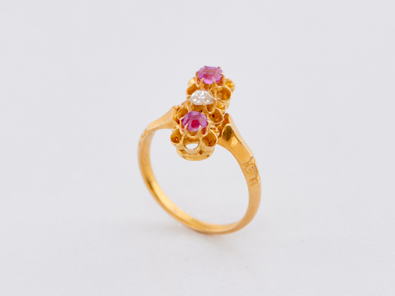A DIAMOND AND RUBY RING IN HIGH CARAT GOLD, SIZE J, 3.4GMS