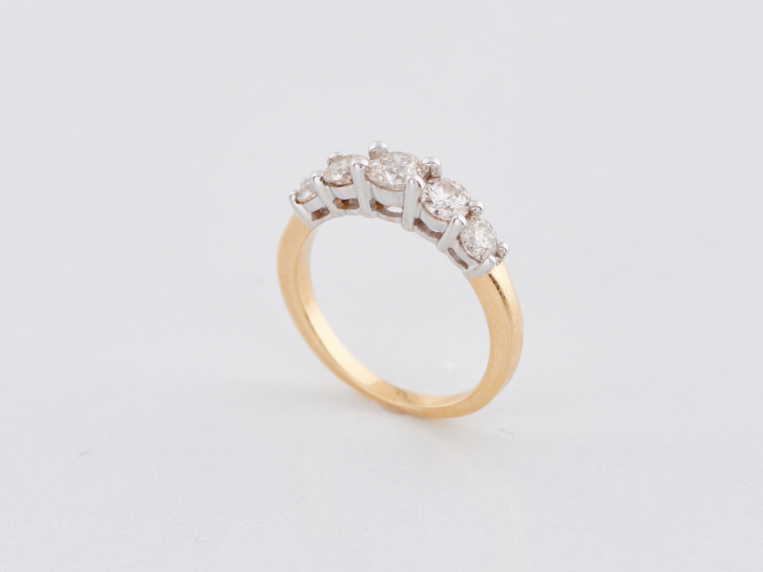 A FIVE STONE DIAMOND RING IN 18CT GOLD AND WHITE GOLD, THE DIAMONDS TOTALLING 1.00CTS, SI2-P1, H-I, 2.94GMS, WITH VALUATION