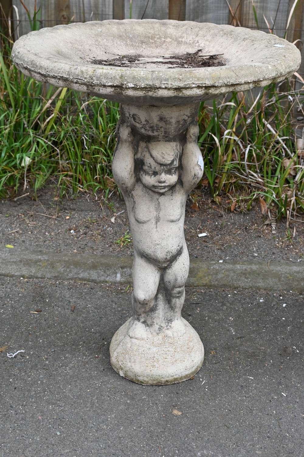 A CONCRETE FIGURAL BIRDBATH ( A/F) ( 82H X 59 DIAMETER CM) (PLEASE NOTE THIS HEAVY ITEM MUST BE REMOVED BY CLIENTS OR CARRIERS AT THE CUSTOMERS EXPENSE. LEONARD JOEL STAFF CANNOT ASSIST CARRYING THIS ITEM)