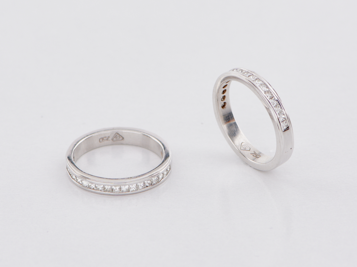TWO DIAMOND SET CHANNEL RINGS IN 18CT WHITE GOLD, THE DIAMONDS TOTALLING APPROXIMATELY 0.5CTS, SI, F-G, SIZE N-O, 9.41GMS, WITH VALUATION
