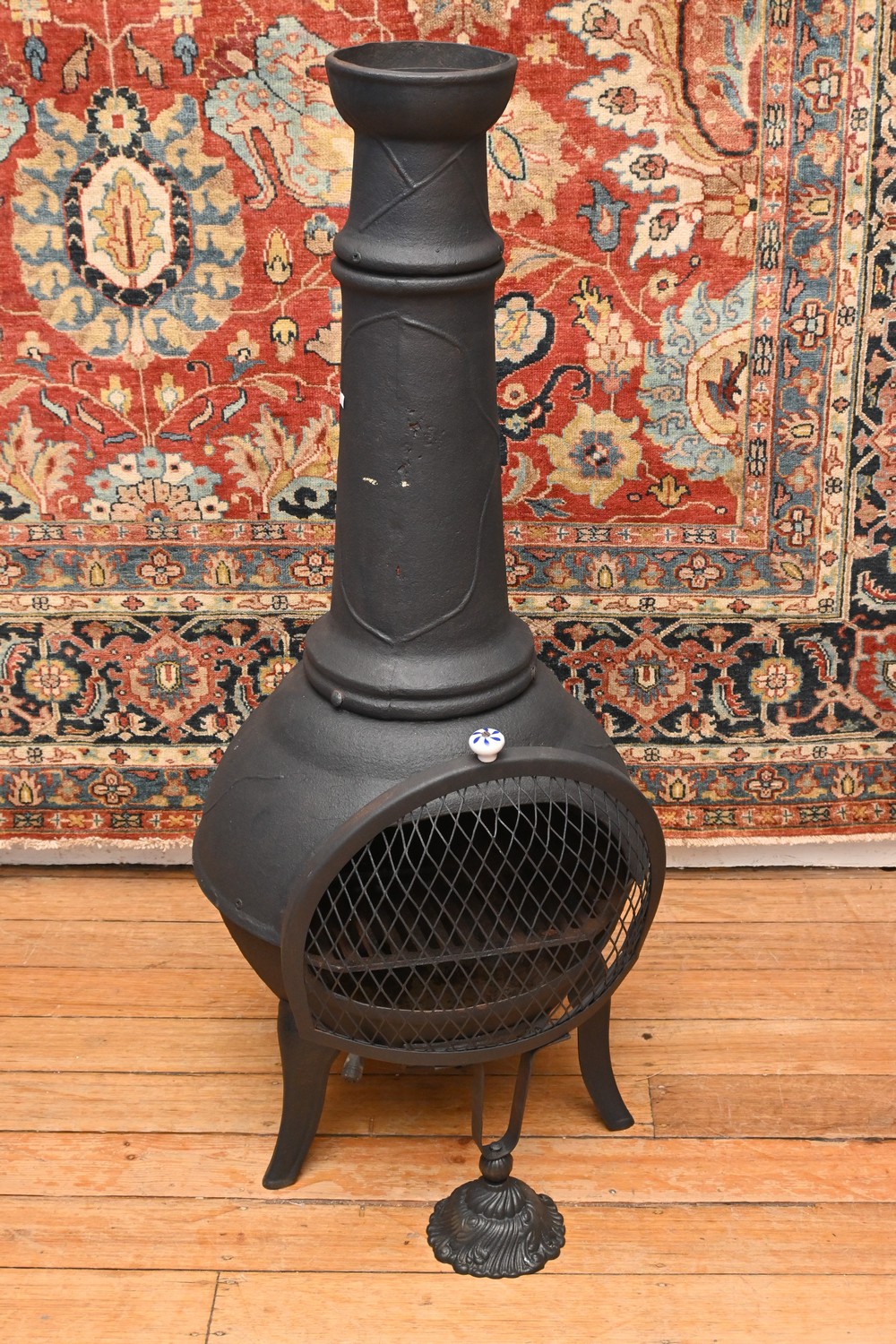 A CAST IRON POT BELLY STOVE WITH GUARD (A/F) (115H X 52D CM) (PLEASE NOTE THIS HEAVY ITEM MUST BE REMOVED BY CLIENTS OR CARRIERS AT THE CUSTOMERS EXPENSE. LEONARD JOEL STAFF CANNOT ASSIST CARRYING THIS ITEM)