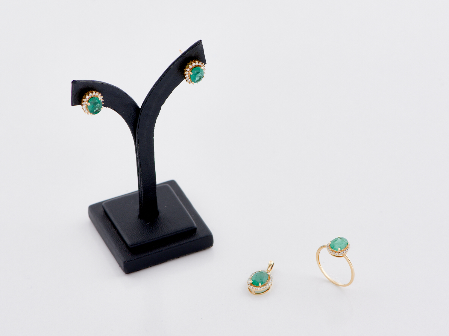 AN EMERALD SET SUITE INCLUDING EARRINGS TO POST AND BUTTERFLY FITTINGS, A RING AND A PENDANT IN 9CT GOLD, SIZE N, WITH VALUATION