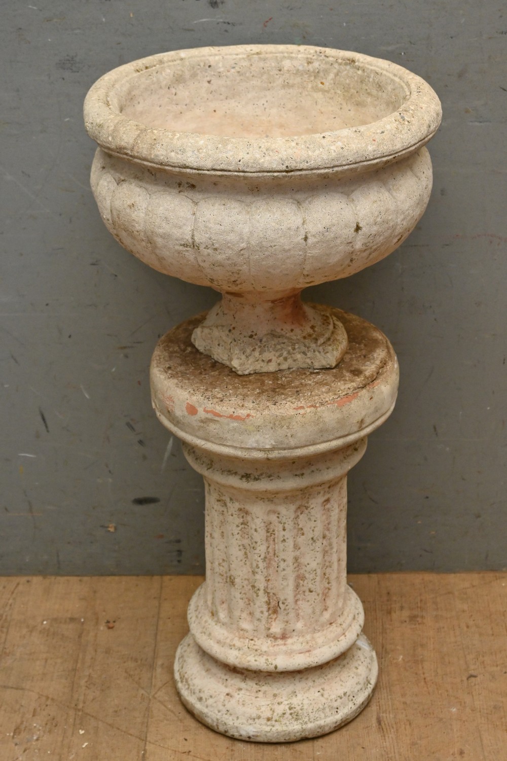 A CONCRETE PLANTER ON PEDESTAL BASE (A/F) (83H X 40D CM) (PLEASE NOTE THIS HEAVY ITEM MUST BE REMOVED BY CLIENTS OR CARRIERS AT THE CUSTOMERS EXPENSE. LEONARD JOEL STAFF CANNOT ASSIST CARRYING THIS ITEM)