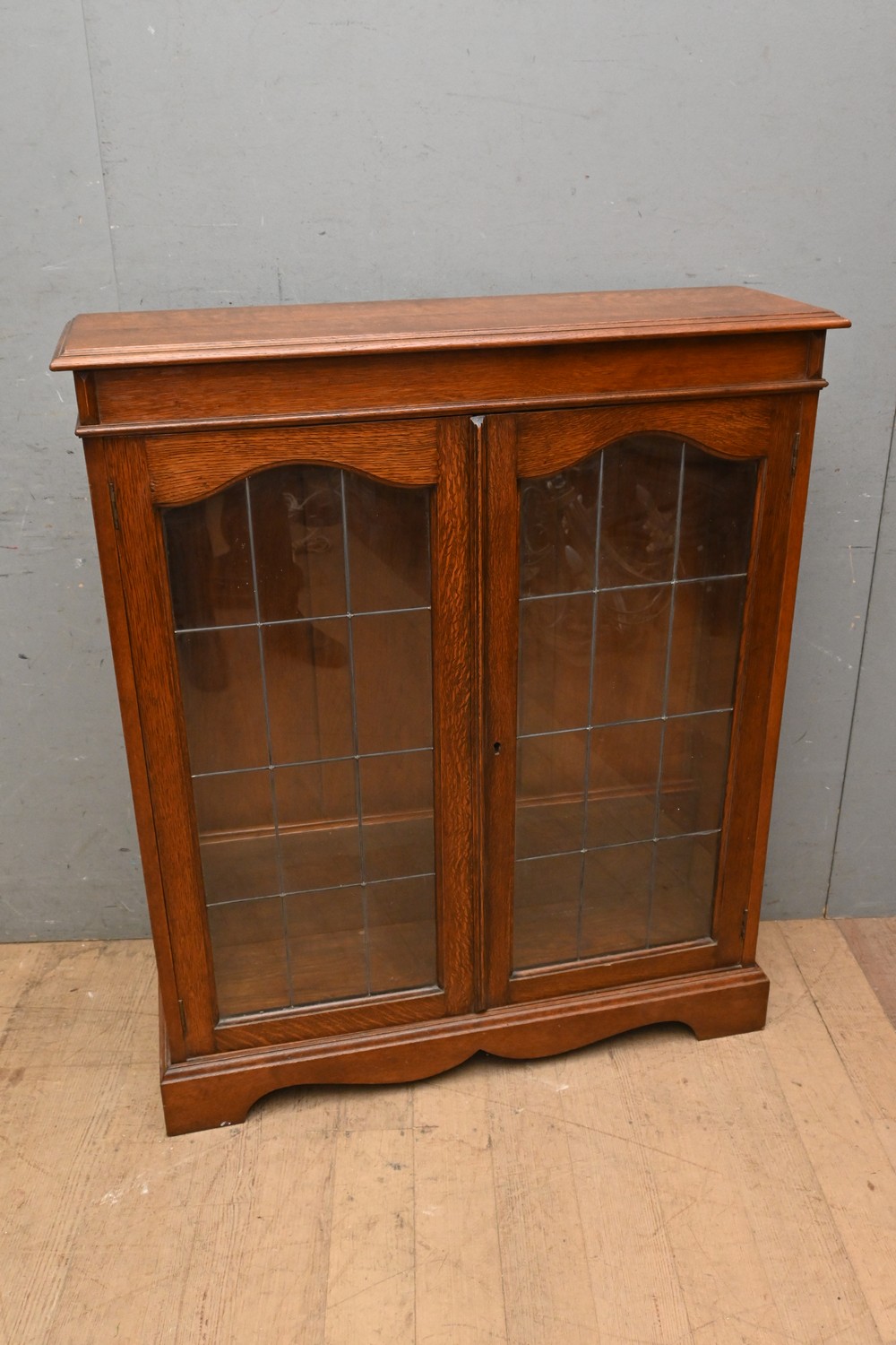 AN ARTS AND CRAFTS OAK TWO DOOR DISPLAY CABINET (A/F) (108H X 91W X 28D CM) (PLEASE NOTE THIS HEAVY ITEM MUST BE REMOVED BY CLIENTS OR CARRIERS AT THE CUSTOMERS EXPENSE. LEONARD JOEL STAFF CANNOT ASSIST CARRYING THIS ITEM)