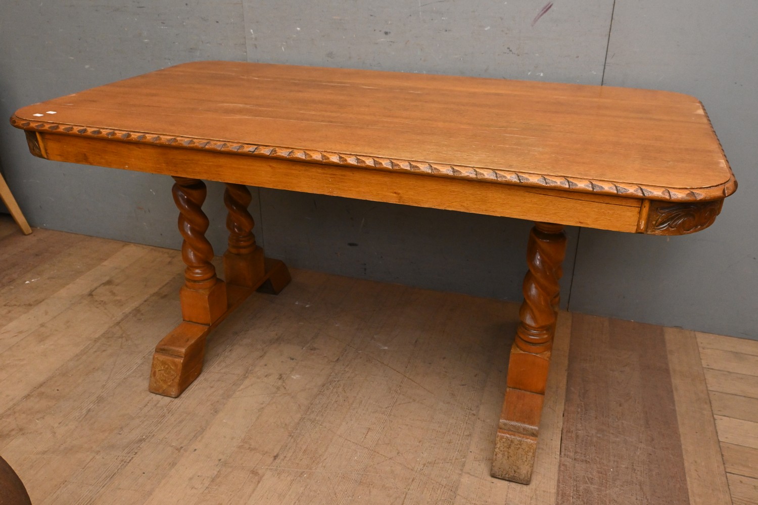 AN OAK CARVED TABLE (A/F) (76H X 155W X 84D CM) (PLEASE NOTE THIS HEAVY ITEM MUST BE REMOVED BY CLIENTS OR CARRIERS AT THE CUSTOMERS EXPENSE. LEONARD JOEL STAFF CANNOT ASSIST CARRYING THIS ITEM)