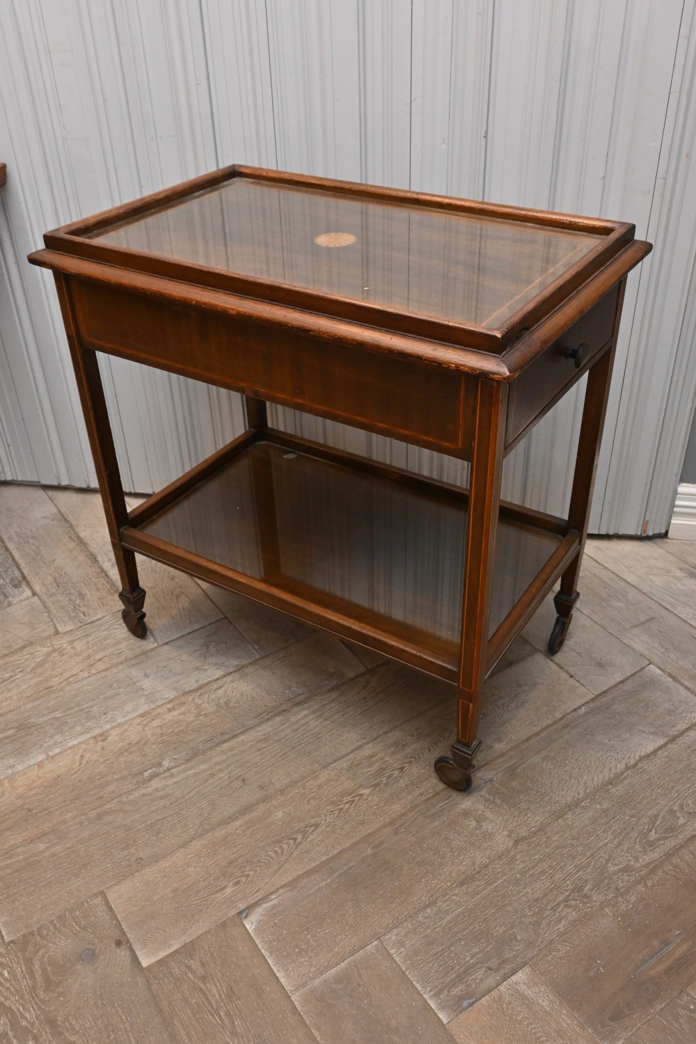 A SHERATON REVIVAL INLAID SINGLE DRAWER DRINKS TROLLEY (A/F) (84H X 80W X 51D CM) (LEONARD JOEL DELIVERY SIZE: LARGE)
