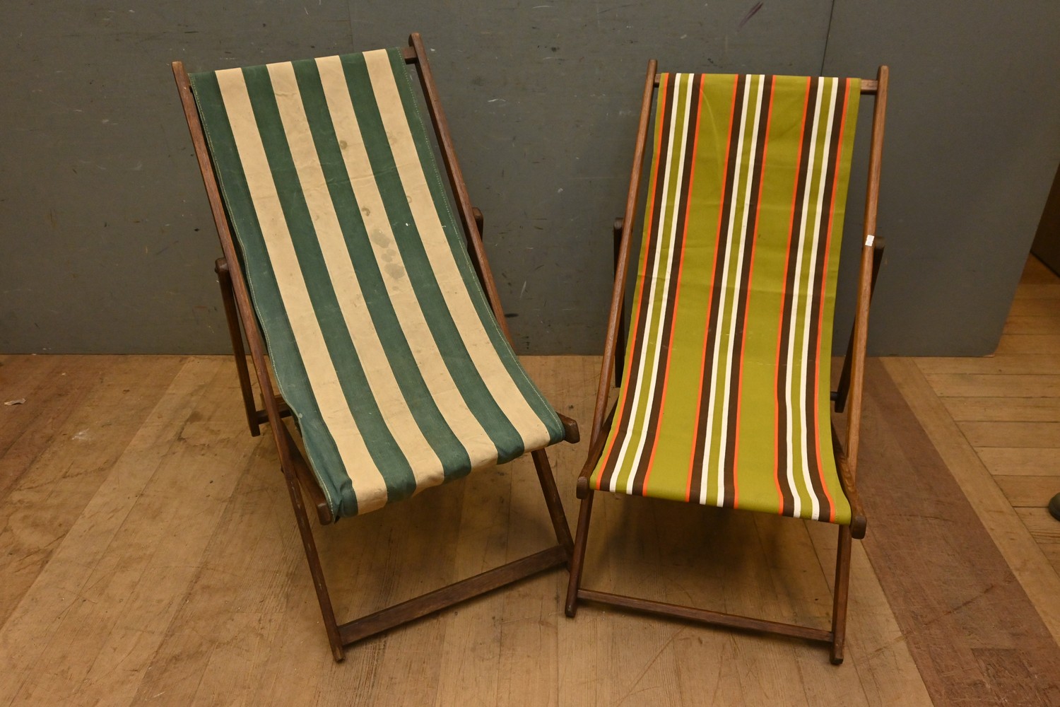A PAIR OF 1960'S CANVAS FOLD OUT SUN CHAIRS (A/F) (36H X 51W X 100D CM) (LEONARD JOEL DELIVERY SIZE: LARGE)