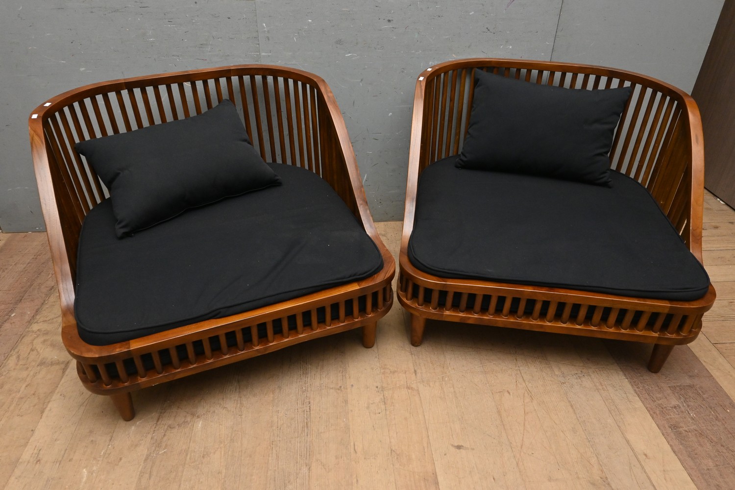 A PAIR OF SCANDINAVIAN STYLE TEAK LOUNGE CHAIRS ( 72H X 91W X 90D CM) (PLEASE NOTE THIS HEAVY ITEM MUST BE REMOVED BY CLIENTS OR CARRIERS AT THE CUSTOMERS EXPENSE. LEONARD JOEL STAFF CANNOT ASSIST CARRYING THIS ITEM)