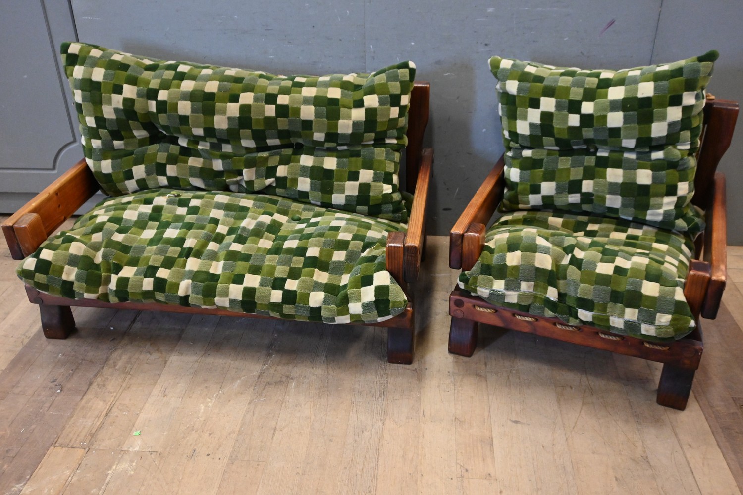 A POST AND BEAM STYLE TWO PIECE LOUNGE SUITE WITH ROPE SUPPORT, CIRCA 1970'S (A/F) (97H X 82W X 90D CM) (LEONARD JOEL DELIVERY SIZE: X- LARGE)