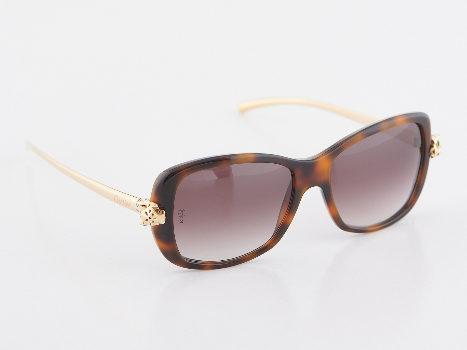 CARTIER, PAIR OF SUNGLASSES - The frames styled in tortoise composite, featuring panther head accents at temple, with gold tone arms.