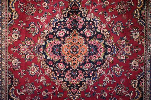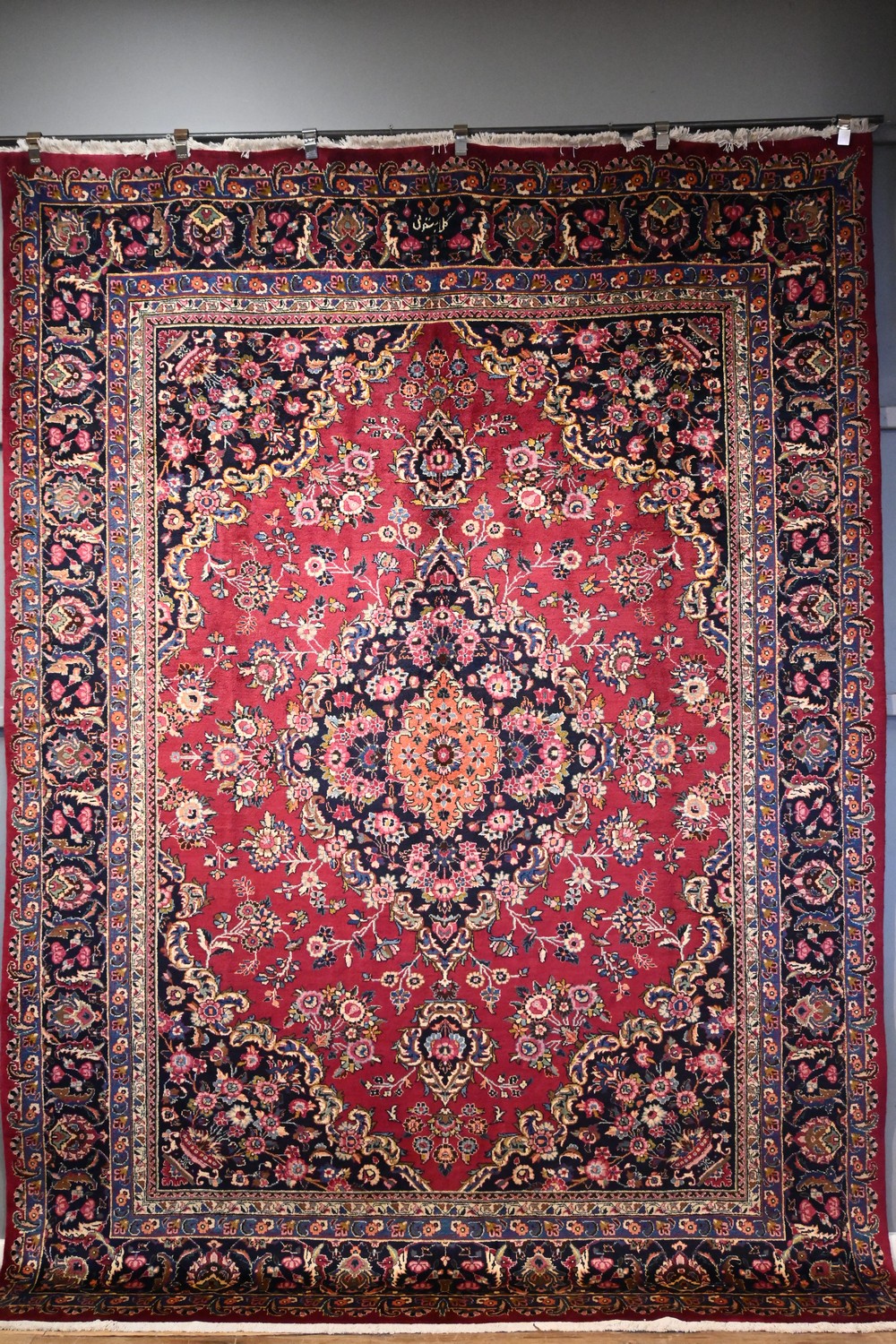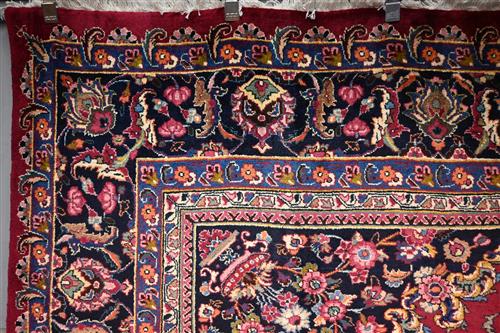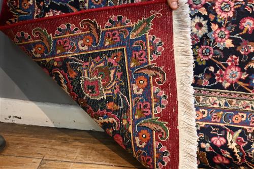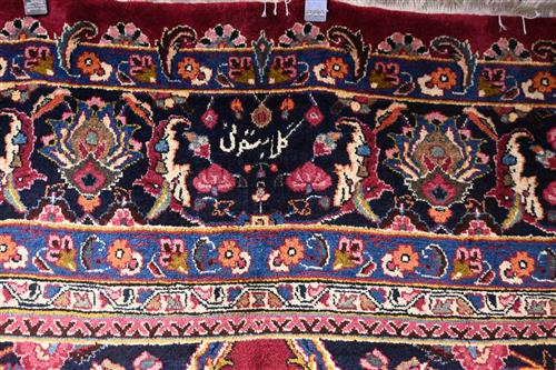 A MAGNIFICENT PERSIAN SOLID & DENSE WEAVE KASHMAR RUG, FROM THE KHORASAN PROVINCE. 100% WOOL PILE AND HARD-WEARING. STUNNING CENTRAL FLORAL ELONGATED MEDALLION ON A DEEP PLUM FIELD WITH ALL OVER FLORAL SPRAYS OF WILD CARNATION AND PLUM BLOSSOM, AND TENDRILS. CORNER MEDALLIONS OF BASKETS BEARING FLORAL SPRAYS IN A CHARCOAL TONE FIELD. BORDER OF PALMETTES AND FLORAL SPRAYS ON A CHARCOAL FIELD. SIGNED PIECE, ATELIER 'GOLABETONI" IN EXCELLENT CONDITION. AS NEW. SIZE: 333 X 246 CM ORIGIN: PERSIA - RRP: $8,900 DOCUMENTATION OF AUTHENTICITY INCLUDED