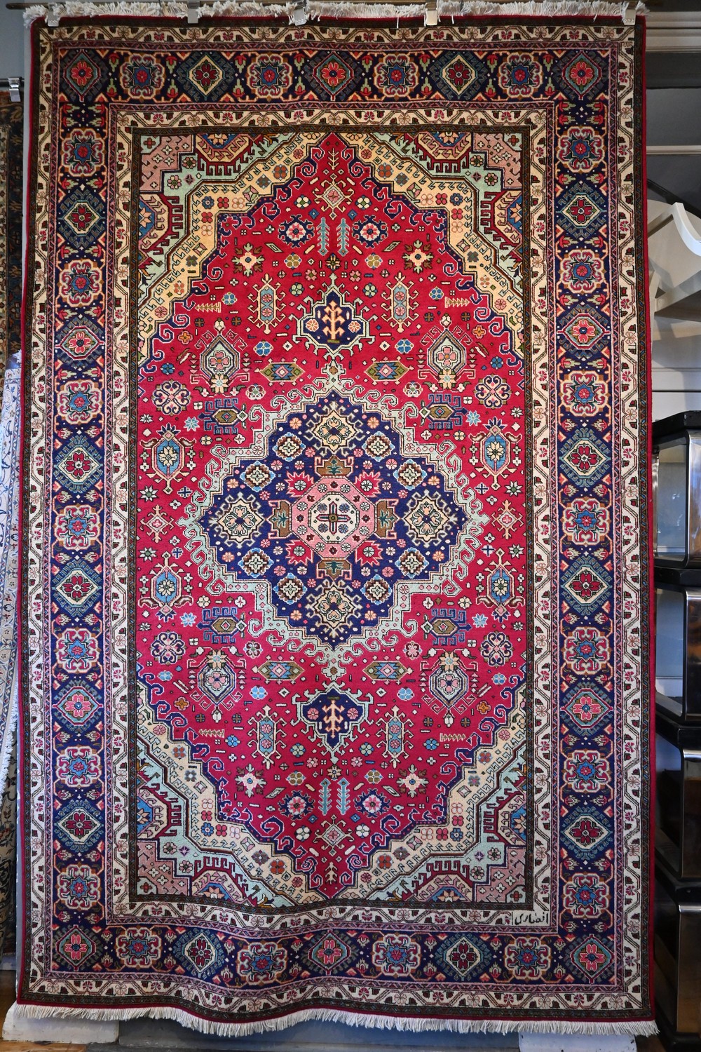 A PERSIAN TABRIZ AZARSHAHR CARPET. 100% DENSE WOOL PILE. EXCELLENT CONDITION. CLASSIC TABRIZ CAUCASIAN DESIGN OF FLORAL ANCHORED MEDALLION IN A ROYAL RED FIELD OF FLORAL ROSETTES AND GEOMETRIC MOTIFS. UNIQUE CORNER MEDALLIONS. MAJOR BORDER OF FLORAL PALMETTES IN A ROYAL BLUE FIELD. SIZE: 301 X 193 CM-ORIGIN: PERSIA - RRP: $4,400 DOCUMENTATION OF AUTHENTICITY INCLUDED.