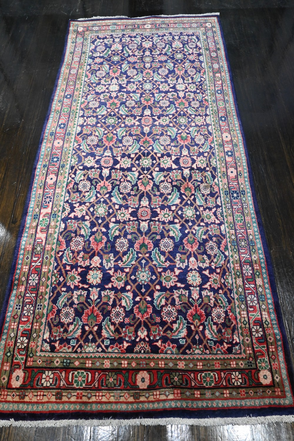 A PERSIAN SAROUQ MAHALL RUG. 100% WOOL. SOLID PLUSH DENSE PILE. HARD WEARING. FINELY HAND KNOTTED CITY WEAVE WITH TRADITIONAL DESIGN OF ALL OVER LARGE HERATI PATTERNS IN A ROYAL PERSIAN BLUE FIELD. BORDER OF ROSETTES. SIZE: 310 X 133 CM-ORIGIN: PERSIA - RRP: $2,900 DOCUMENTATION OF AUTHENTICITY INCLUDED