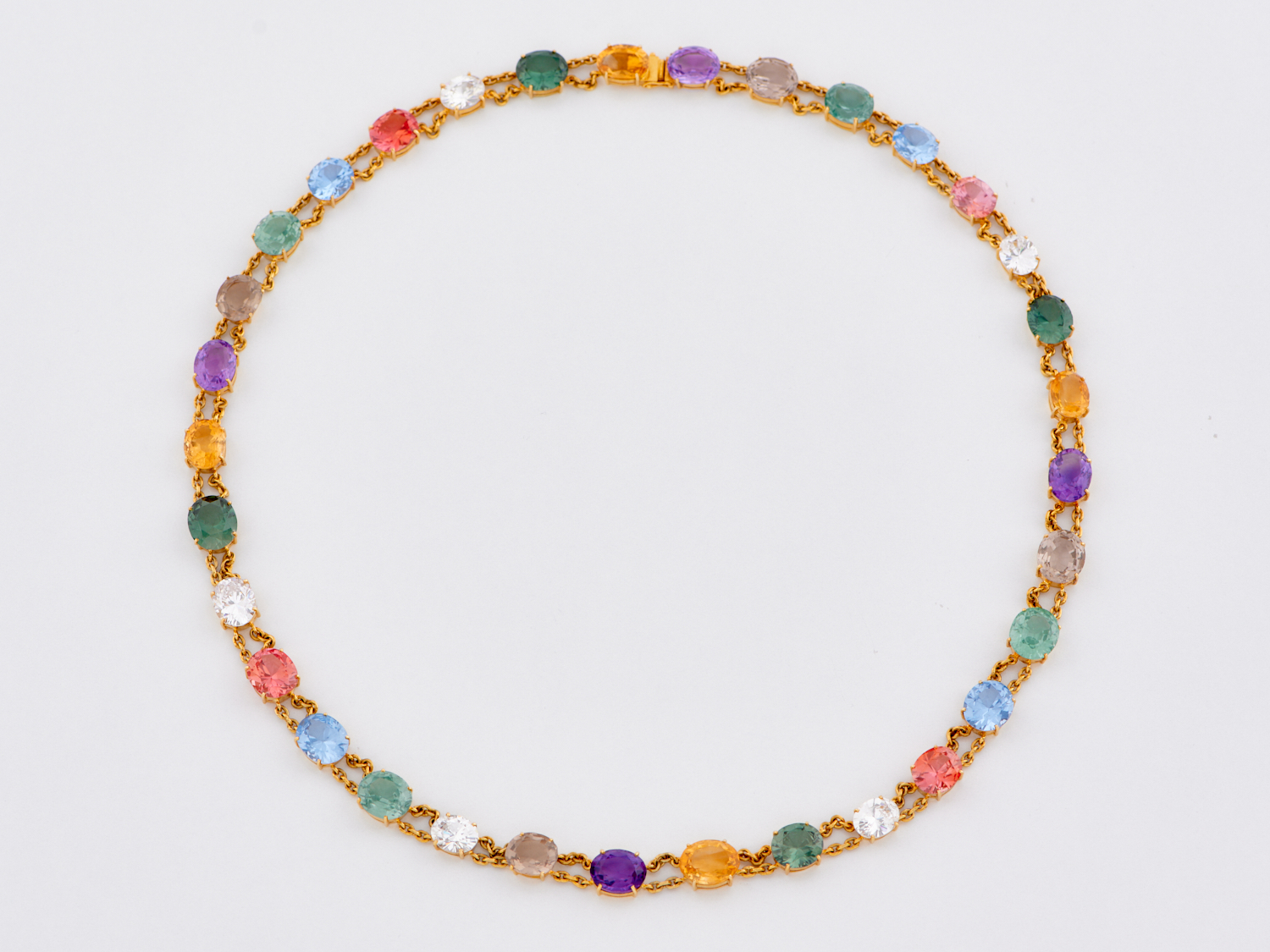 A GEM AND PASTE SET NECKLACE IN 14CT GOLD, LENGTH 600MM, 73.1GMS
