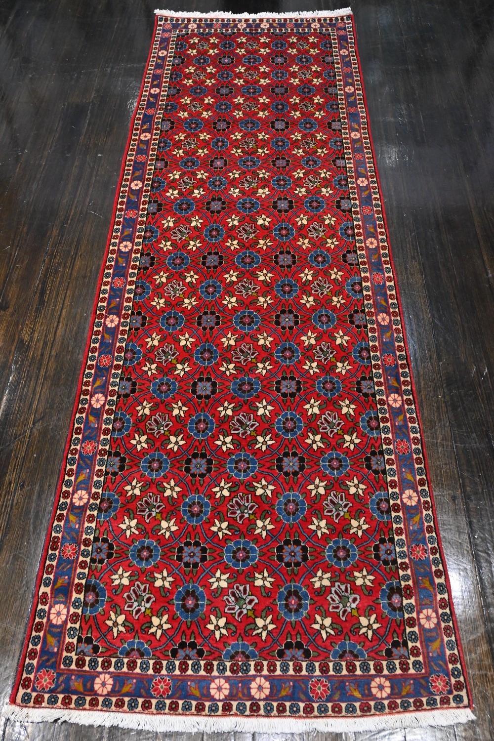 A FINE PERSIAN VARAMIN HALL RUNNER, 100% WOOL. DENSE PILE. STURDY & HARD-WEARING. FINELY HAND-KNOTTED CITY WEAVE WITH ALL OVER MINA KHANI MOTIFS SET WITHIN A RED FIELD WITH TONES OF CREAM, GREEN, AND BLUE. BORDER OF ROSETTES. SIZE: 314 X 100 CM ORIGIN: PERSIA - RRP: $3,900 DOCUMENTATION OF AUTHENTICITY INCLUDED