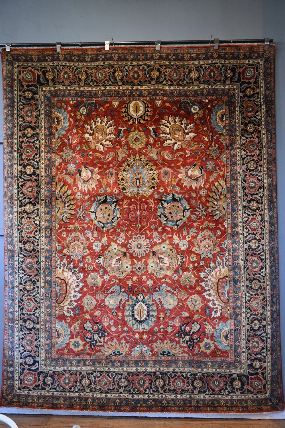 A MOST ATTRACTIVE PERSIAN SERAPI DESIGN. FINELY HAND-KNOTTED WITH THE FINEST HAND SPUN WOOL AND NATURAL DYES, NEW GALLERY CARPET BEING OFFERED. THE CARPET IS PERFECTLY BALANCED IN COLOUR & DESIGN IN TONES OF RUST, GOLD, LIGHT BLUE & INDIGO BLUE. EXTREMELY HARD WEARING, IN PRISTINE NEW CONDITION AN ABSOLUTE DESIRABLE CARPET FOR ALL SETTINGS. SIZE: 305 X 237 CM RRP $7,900 ORIGIN: AGRA TAJ MAHAL PROVINCE DOCUMENTATION OF AUTHENTICITY INCLUDED.