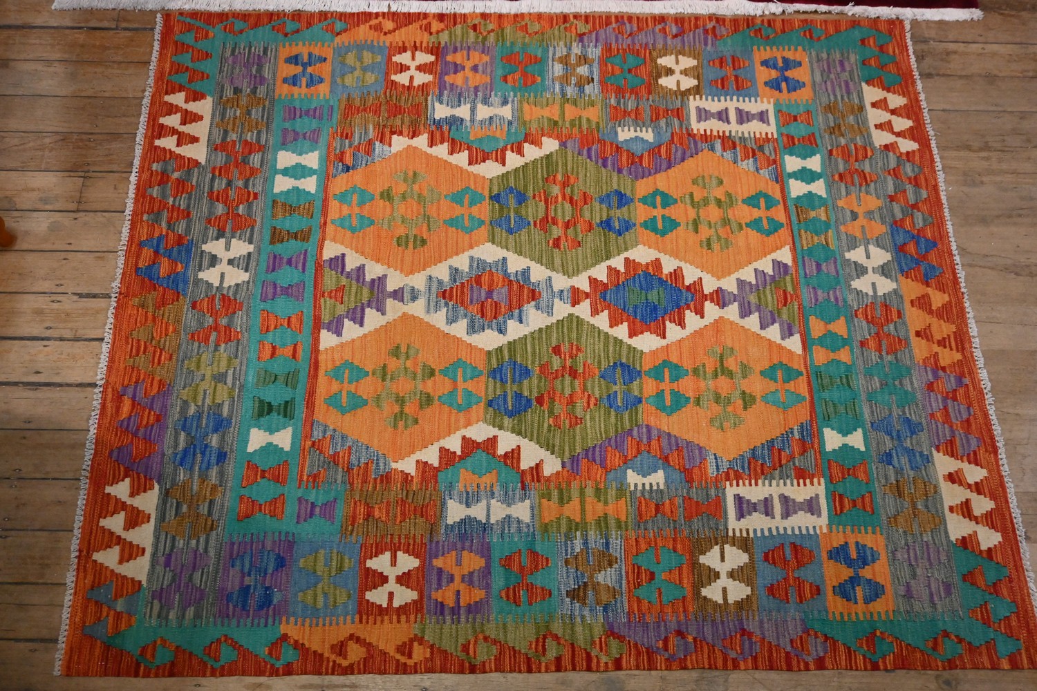 A NEW COLOURFUL & DECORATIVE KILIM KAFKAZI RUG. 100% PURE HAND SPUN WOOL, HAND WOVEN. REVERSABLE, CAUCASIAN INFLUENCE AND DESIGN. SIZE: 195 X 162 CM- RRP: $1,300 ORIGIN: AFGHANISTAN/PESHWER BORDER DOCUMENTATION OF AUTHENTICITY INCLUDED.