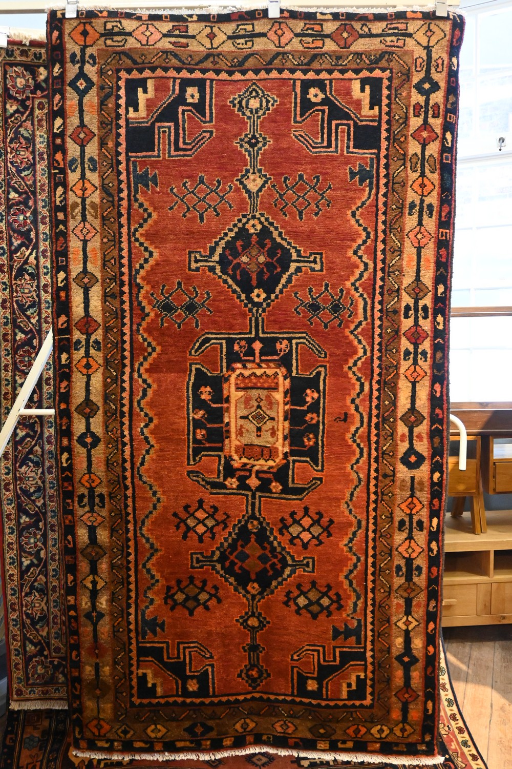 A TRIBAL PERSIAN LURI RUG, 100% WOOL, NATURAL DYES, VINTAGE PILE. TRIBAL WEAVE & DESIGN OF A CENTRAL ELONGATED GEOMETRIC MEDALLION WITH TRIBAL TREE OF LIFE MOTIFS ON A SOFT TONED FIELD. BORDER OF TRIBAL PATTERNS. SIZE: 232 X 124 CM- ORIGIN: IRAN - RRP: $2,200 DOCUMENTATION OF AUTHENTICITY INCLUDED.
