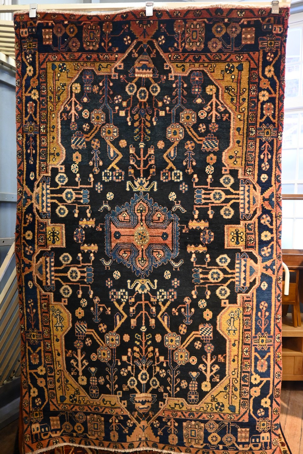 A MAGNIFICENT PERSIAN NAHAVAND RUG. 100% WOOL DENSE PILE, NATURAL DYES. HAND-KNOTTED VILLAGE WEAVE WITH A DESIGN OF A CENTRAL MEDALLION SET WITHIN A FIELD OF VARYING FLORAL PATTERNS AND TREE OF LIFE MOTIFS & HUMAN FIGURES SET ON A DEEP INDIGO BLUE FIELD. UNIQUE BORDERS OF ROSETTES, TREE OF LIFE AND TRIBAL MOTIFS. BEAUTIFUL COLOUR TONES ALL OVER. SIZE: 223 X 135 CM ORIGIN: PERSIA - RRP: $2,400 DOCUMENTATION OF AUTHENTICITY INCLUDED