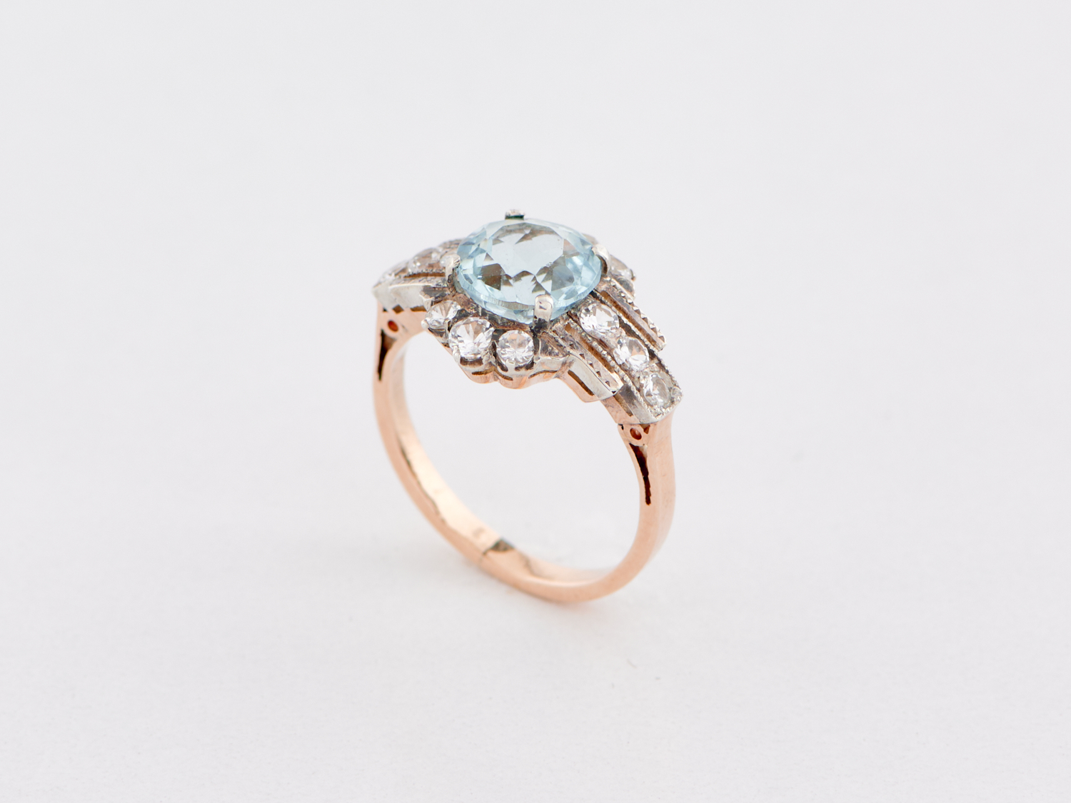 A VINTAGE AQUAMARINE AND SYNTHETIC WHITE SPINEL RING IN 8CT ROSE AND SILVER, RING SIZE K, THE AQUAMARINE TOTALLING 1.72CTS