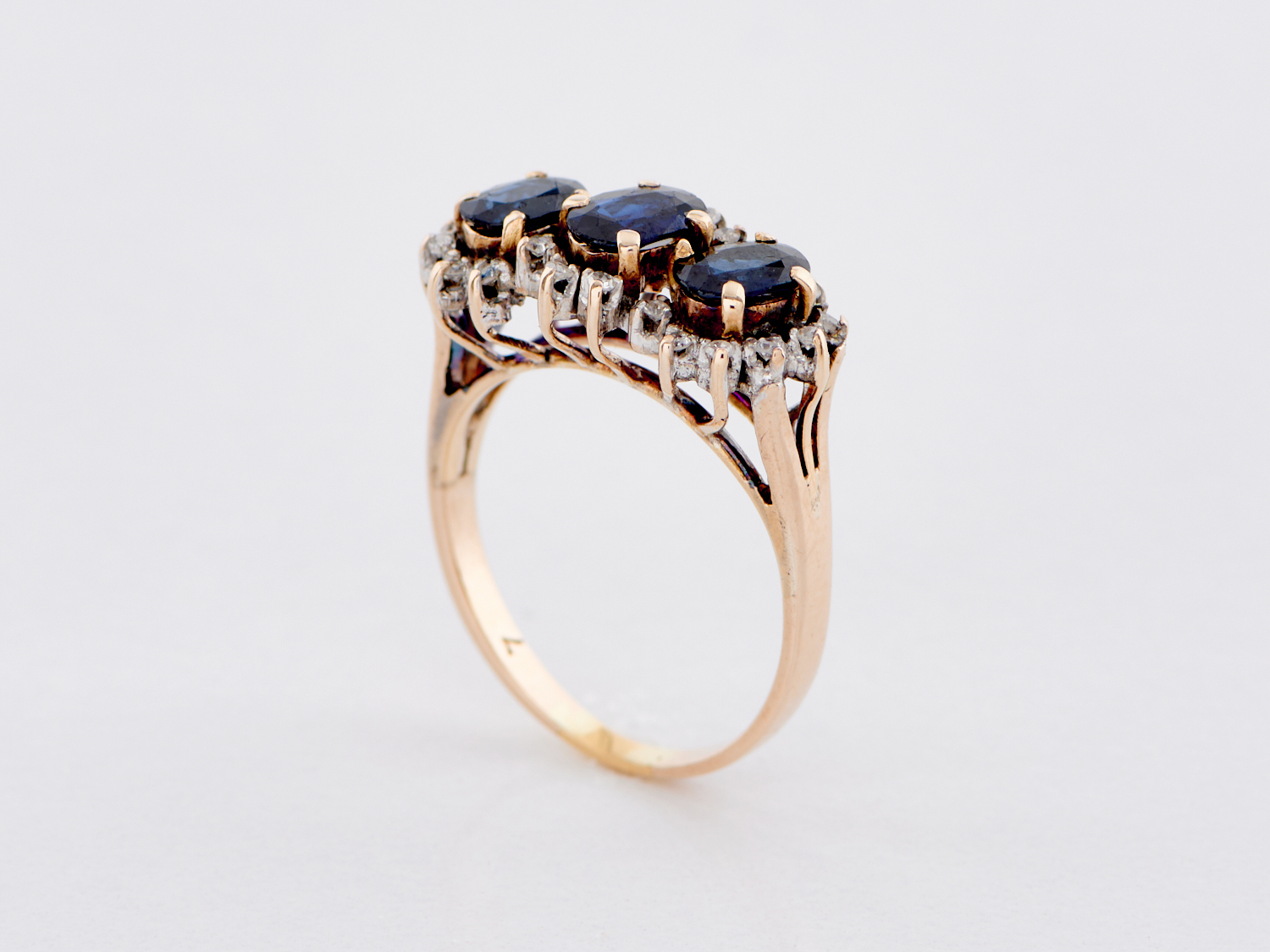 A THREE SAPPHIRE AND DIAMOND SET RING IN 14CT GOLD, THE SAPPHIRES TOTALLING APPROXIMATELY 1.95CTS, THE DIAMOND TOTALLING 0.18CTS, SIZE O, 4.7GMS