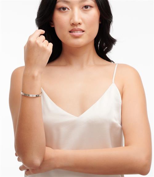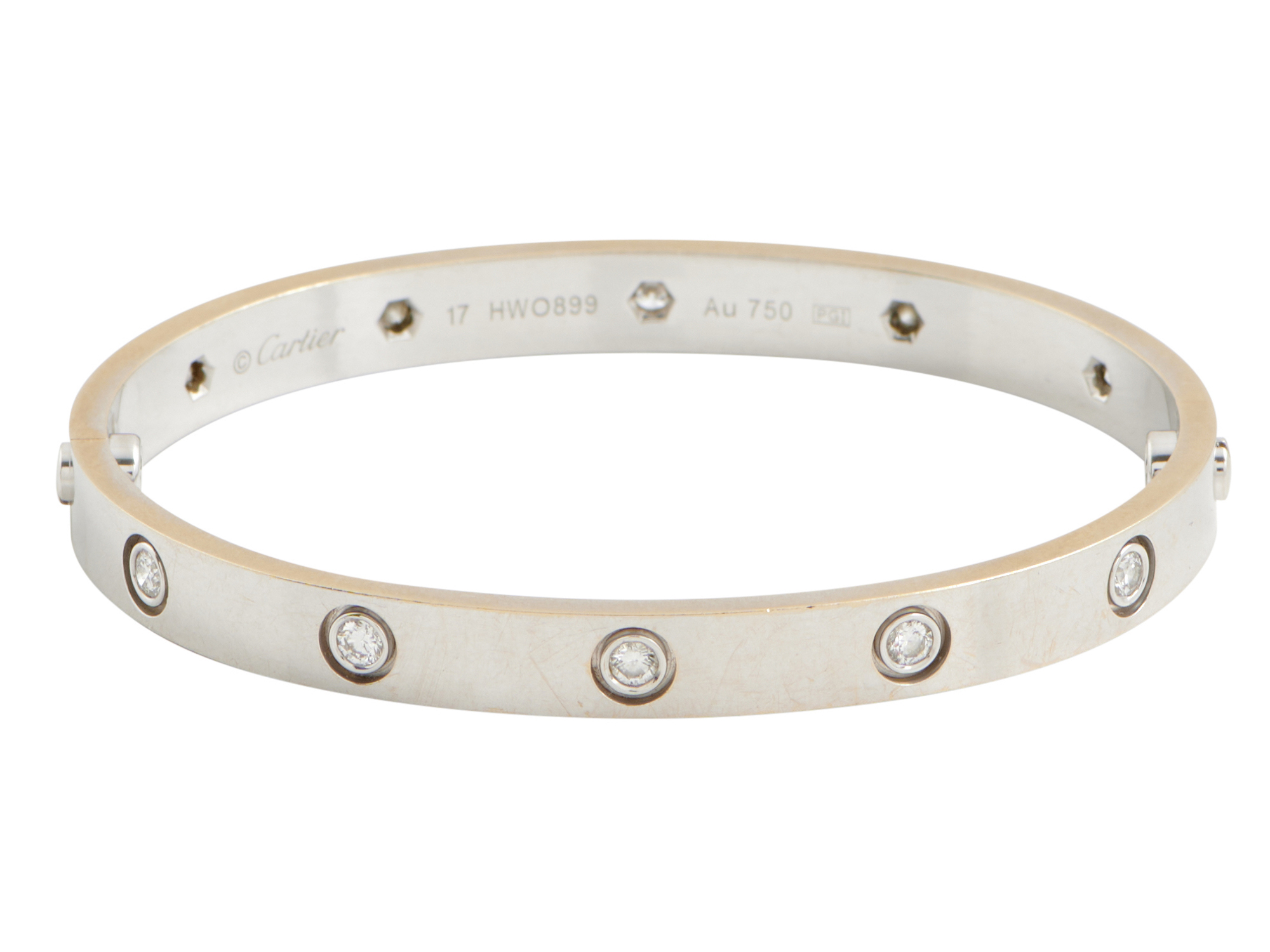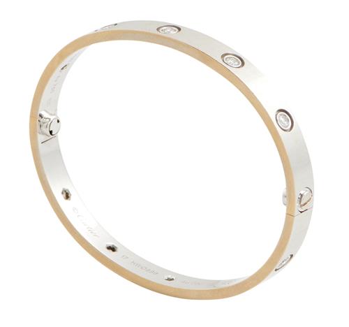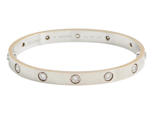 The flat band applied at intervals with ten brilliant-cut diamonds together weighing approximately 0.96 carats, between screwhead motifs with screw down clasps, signed Cartier and numbered HWO899, size 17, diameter approximately 56mm.