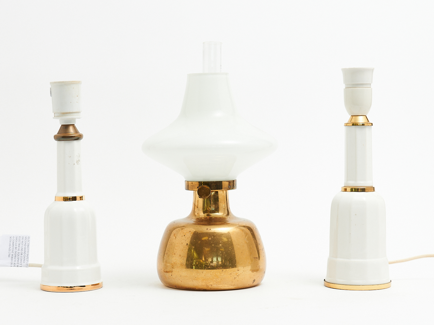 A PAIR OF SCANDINAVIAN CERAMIC TABLE LAMPS TOGETHER WITH OIL LAMP (A/F) H.33CM (TALLEST), LEONARD JOEL LOCAL DELIVERY: MEDIUM