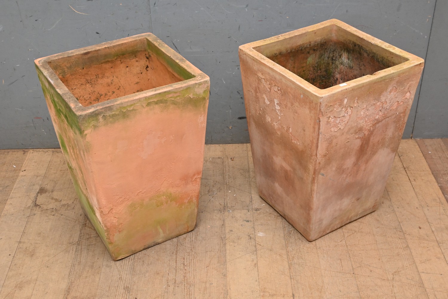 PAIR OF VINTAGE TAPERING SQUARE FORM TERRACOTTA GARDEN PLANTER POTS (A/F) ( 64H X 43W X 43D CM) (PLEASE NOTE THIS HEAVY ITEM MUST BE REMOVED BY CLIENTS OR CARRIERS AT THE CUSTOMERS EXPENSE. LEONARD JOEL STAFF CANNOT ASSIST CARRYING THIS ITEM)