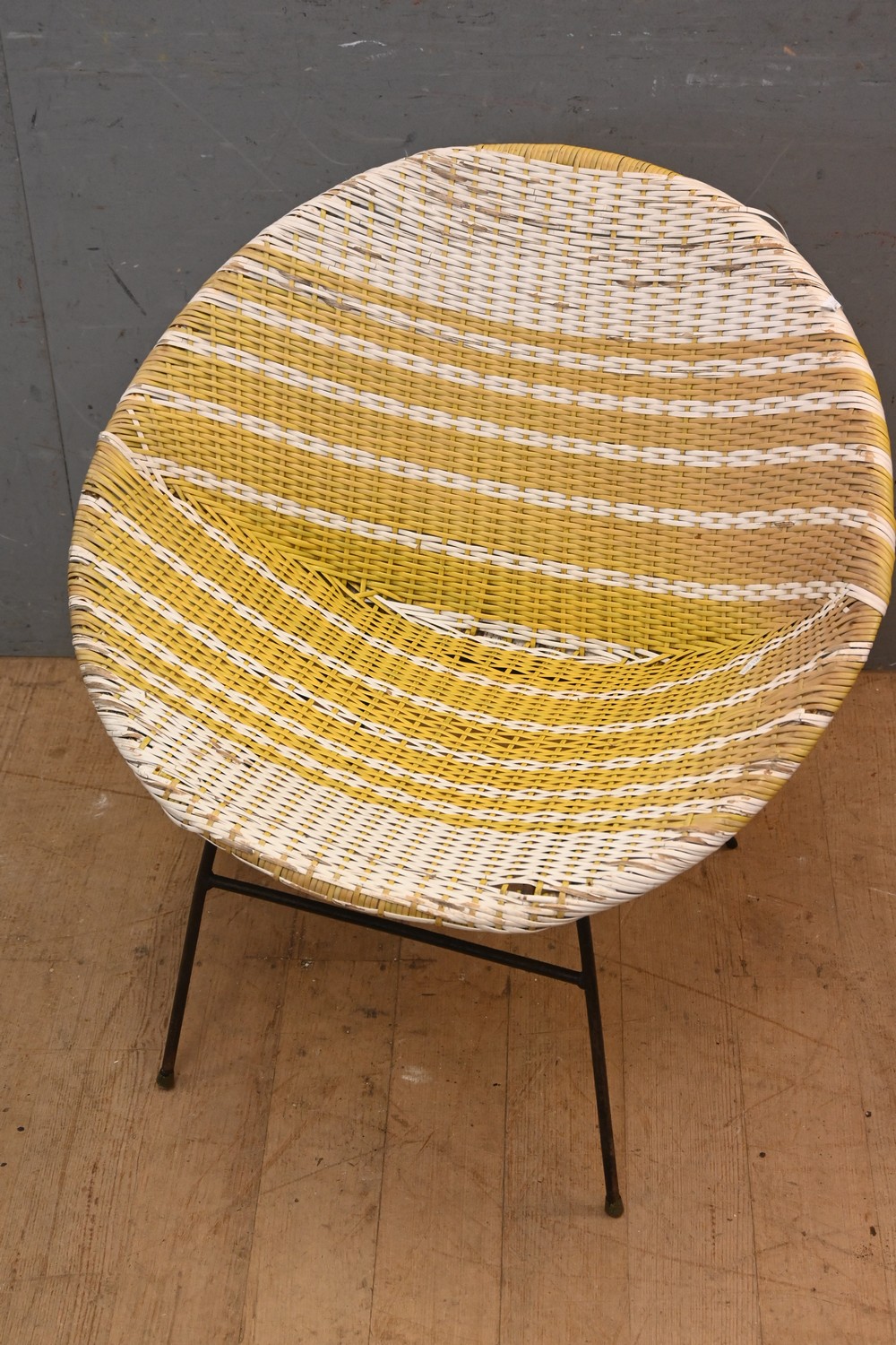 A MID CENTURY WOVEN CANE AND STEEL BASED SAUCER TV CHAIR (A/F) ( 72H X 70W X 60D CM) (LEONARD JOEL DELIVERY SIZE: LARGE)