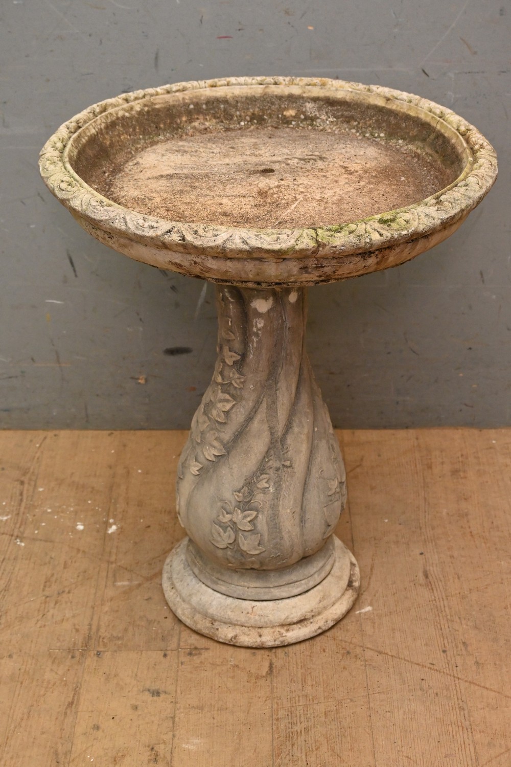 AN AUSTRALIAN RECONSTITUTED STONE BIRD BATH (A/F) (57H X 47D CM) (PLEASE NOTE THIS HEAVY ITEM MUST BE REMOVED BY CLIENTS OR CARRIERS AT THE CUSTOMERS EXPENSE. LEONARD JOEL STAFF CANNOT ASSIST CARRYING THIS ITEM)