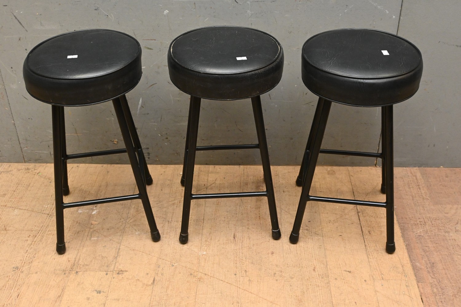 A SET OF THREE VINTAGE AUSTRALIAN MADE KENDALL BLACK VINYL AND STEEL STOOLS (52H X 29D CM) (LEONARD JOEL DELIVERY SIZE: LARGE)