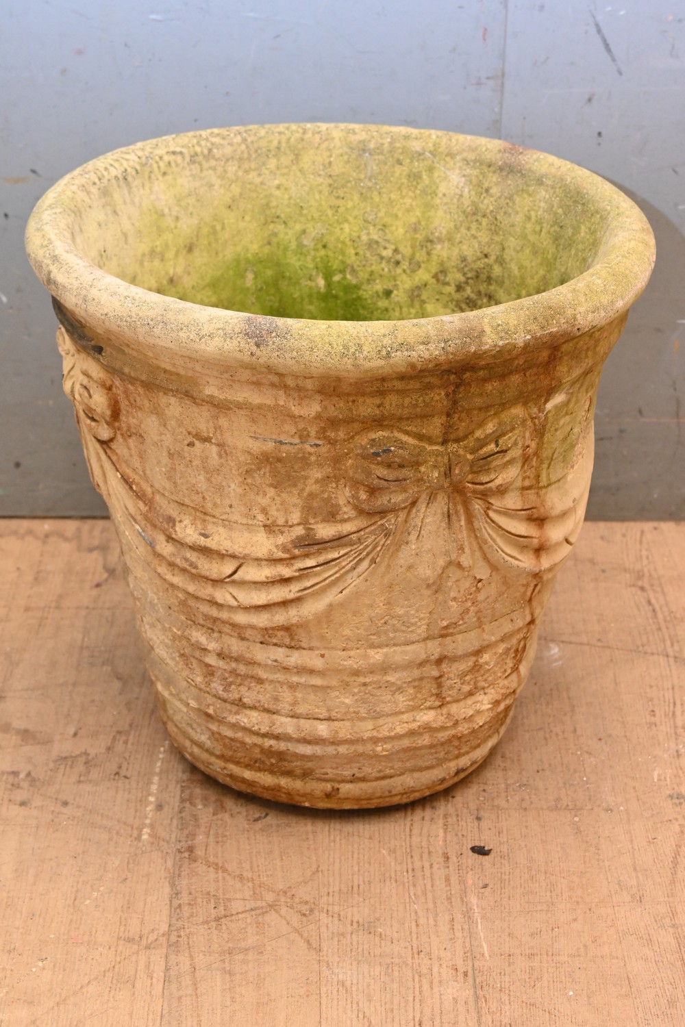 A LARGE 1940S RECONSTITUTED STONE PLANTER POT WITH RIBBON TIED BOW DECORATION TO SIDE ( 45H X 45 DIAMETER CM) (PLEASE NOTE THIS HEAVY ITEM MUST BE REMOVED BY CLIENTS OR CARRIERS AT THE CUSTOMERS EXPENSE. LEONARD JOEL STAFF CANNOT ASSIST CARRYING THIS ITEM)