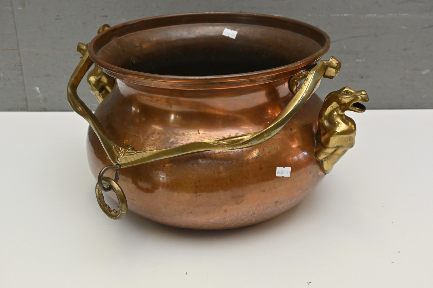 A FRENCH SOLID COPPER AND BRASS SWING HANDLED HORSE ADORNED POT ( 25H X 48 DIAMETER CM) (LEONARD JOEL DELIVERY SIZE: MEDIUM)