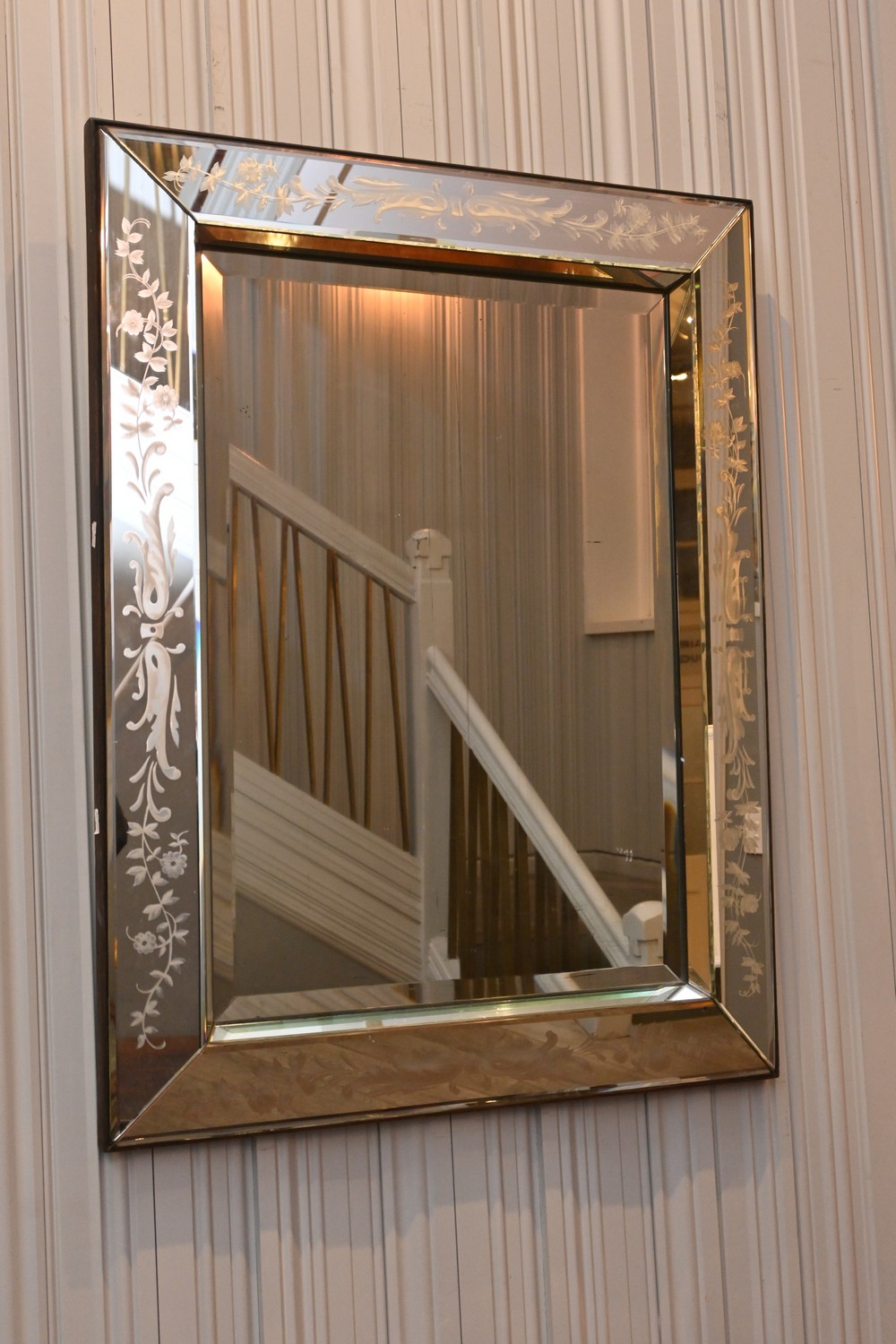 A FRENCH ENGRAVED FLORAL MOTIF WOODEN BACKED MIRROR (A/F) (88H X 68W CM) (LEONARD JOEL DELIVERY SIZE: LARGE)
