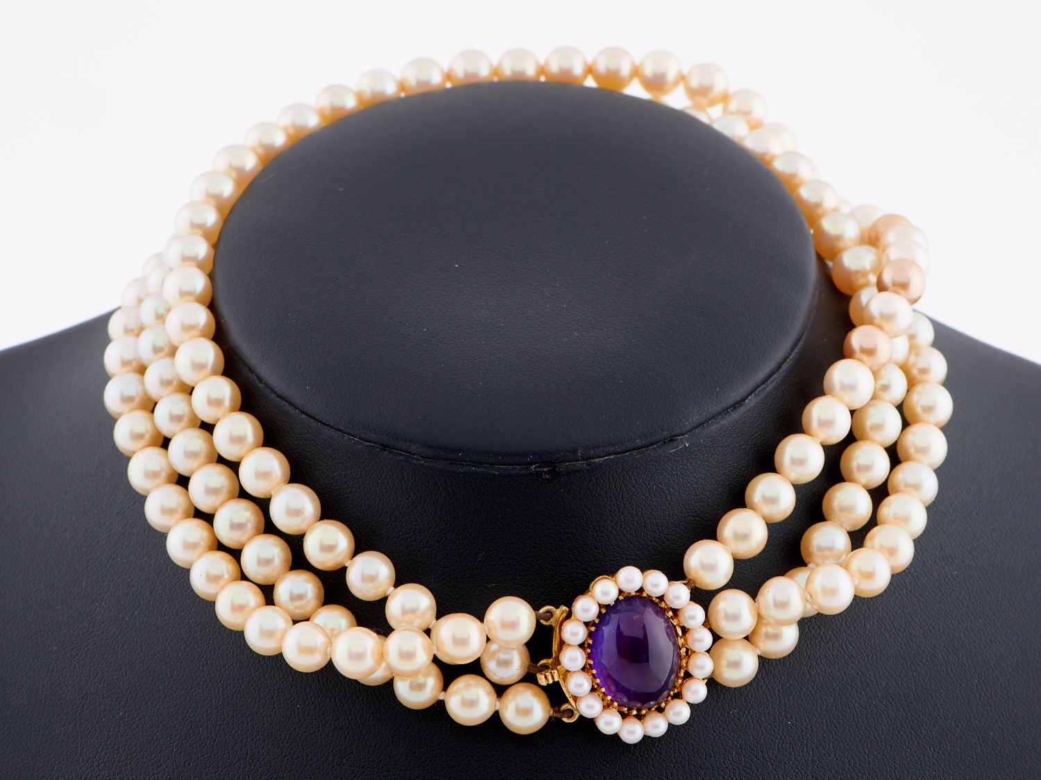 A TRIPLE STRAND FAUX PEARL CHOKER TO A CABOCHON AMETHYST CLASP IN 9CT GOLD, 330MM