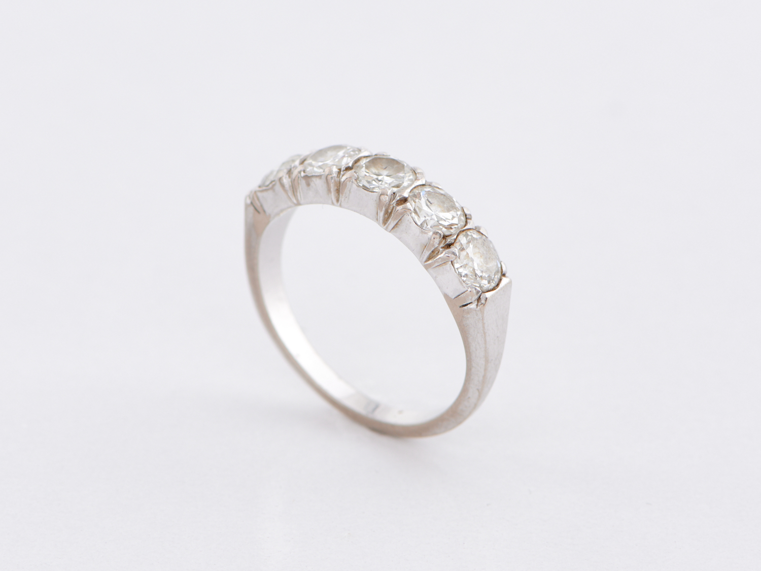 A FIVE STONE DIAMOND RING IN 18CT WHITE GOLD, THE DIAMONDS TOTALLING APPROXIMATELY 1.70 CARATS, APPROXIMATE RING SIZE O, APPROXIMATE WEIGHT 4.8GMS.