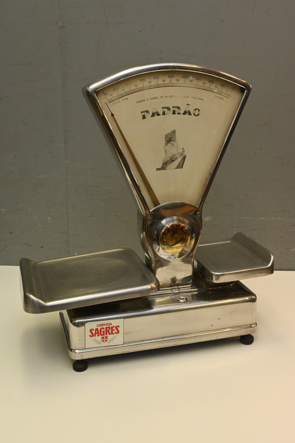 A RETRO PORTUGUESE STAINLESS STEEL SET OF SCALES (A/F) (70H X 61W X 32D CM) (PLEASE NOTE THIS HEAVY ITEM MUST BE REMOVED BY CLIENTS OR CARRIERS AT THE CUSTOMERS EXPENSE. LEONARD JOEL STAFF CANNOT ASSIST CARRYING THIS ITEM)