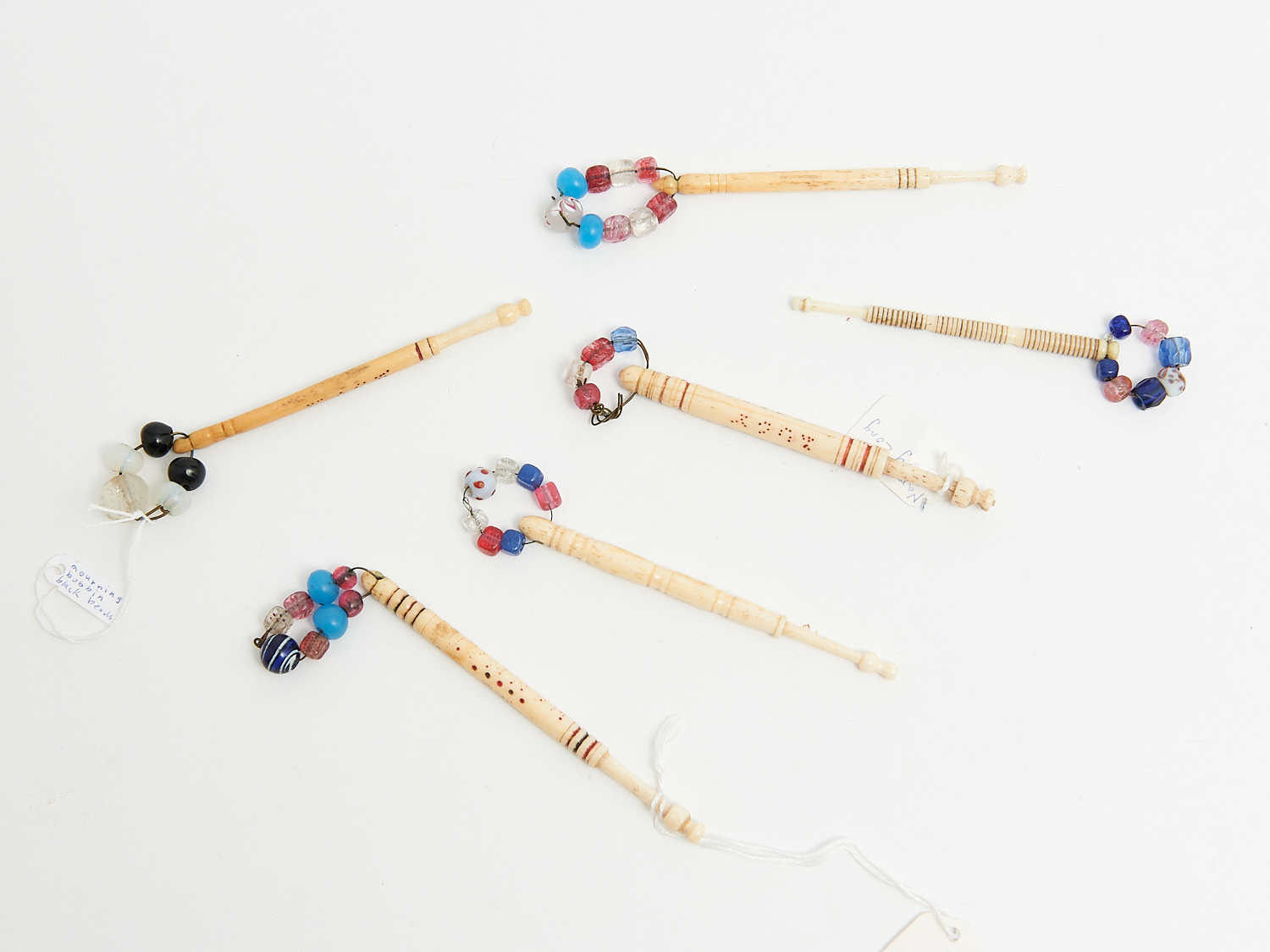 A GROUP OF SIX BONE LACE BOBBINS WITH HAND MADE BEADS, CIRCA 19TH CENTURY L.10CM, LEONARD JOEL LOCAL DELIVERY: SMALL
