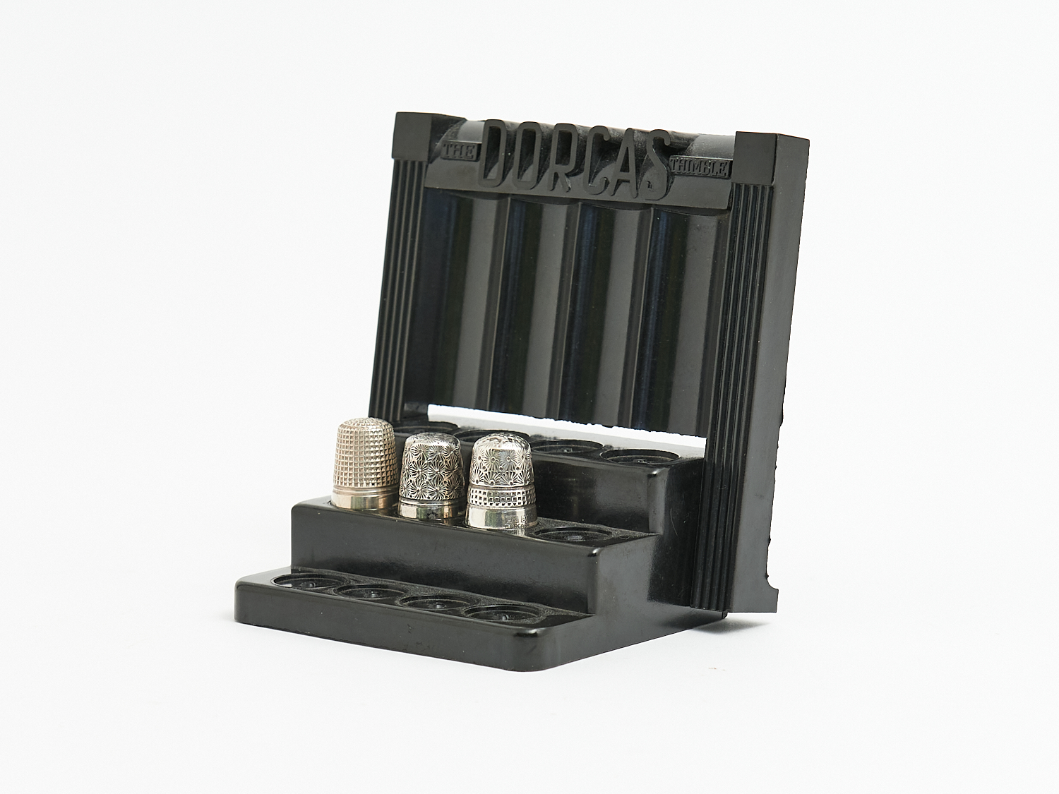A BAKELITE DORCAS THIMBLE STAND AND THREE DORCAS THIMBLES H.12.5CM, LEONARD JOEL LOCAL DELIVERY: SMALL