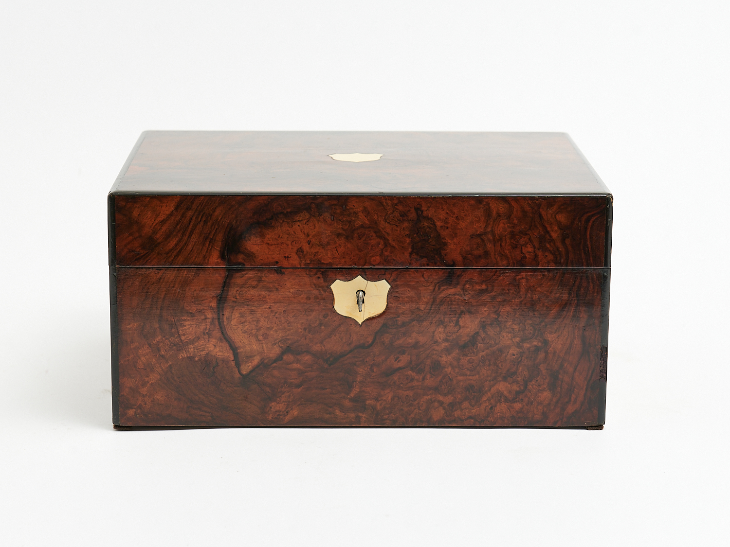 A WOODEN SEWING BOX WITH BONE INLAY H.15CM X W.31CM X D.23.5CM, LEONARD JOEL LOCAL DELIVERY: MEDIUM