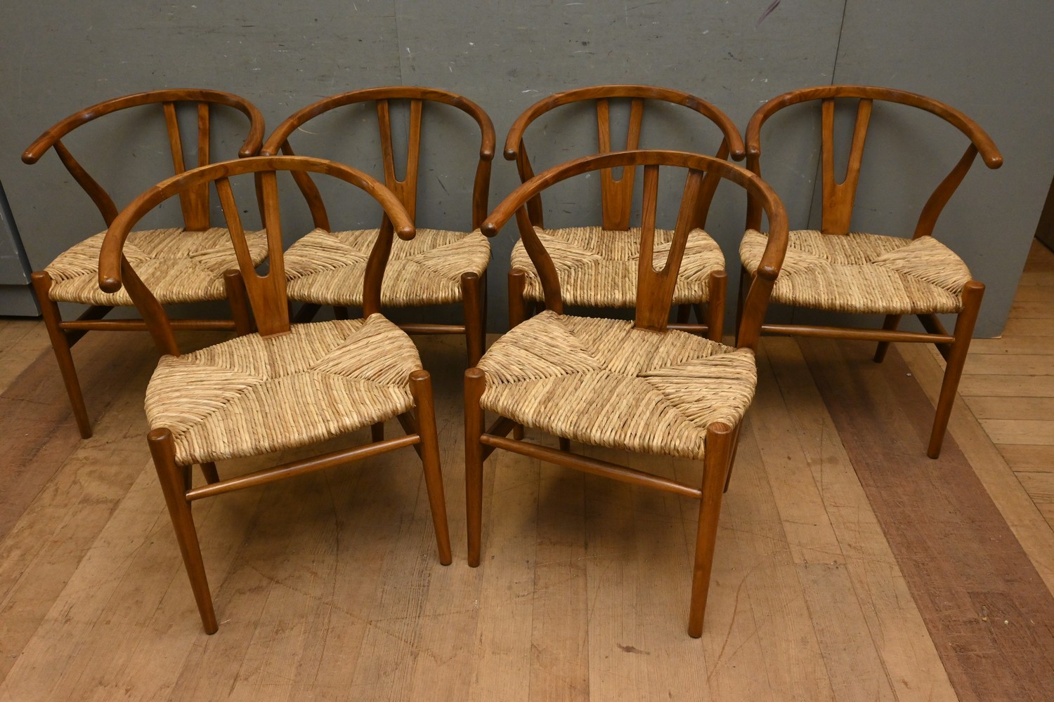A SET OF SIX WISHBONE STYLE CHAIRS WITH NATURAL RUSH SEAT (75H X 54W X 55D CM) (LEONARD JOEL DELIVERY SIZE: X-LARGE)
