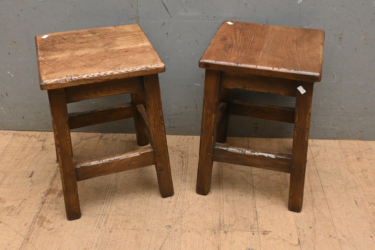 A PAIR OF SQUARE OAK JOINT STOOLS (45H X 31W X 31D CM) (LEONARD JOEL DELIVERY SIZE: LARGE)