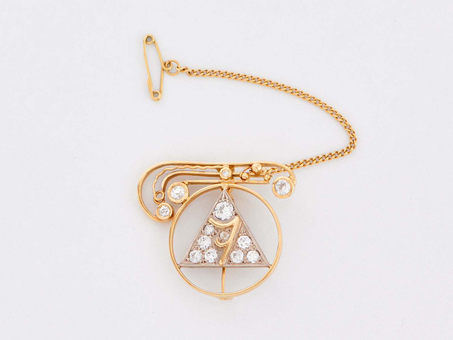 A DIAMOND ABSTRACT BROOCH IN 18CT GOLD, 4 X 3.5CM, 13.42GMS