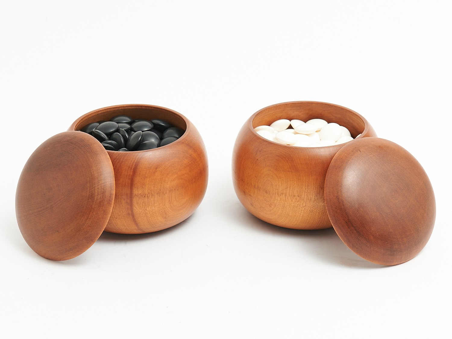 A SET OF VINTAGE JAPANESE HYUGA CLAMSHELL AND NACHIGURO SLATE BLACK STONE GO PIECES, IN WOODEN CONTAINERS, APPROX SIZE 35, LEONARD JOEL LOCAL DELIVERY: SMALL