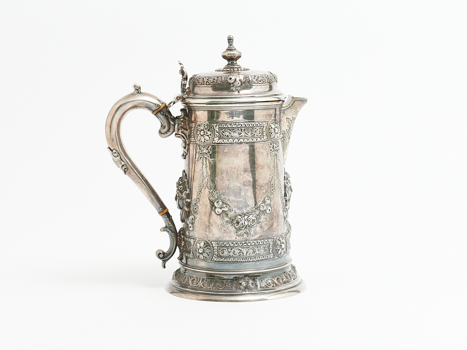 A LARGE STERLING SILVER FLAGON BY RICHARD MARTIN & EBENEZER HALL MARTIN 1878, OF CYLINDRICAL FORM WITH HINGED LID. 1049 GRAMS, H.25CM, LEONARD JOEL LOCAL DELIVERY: SMALL