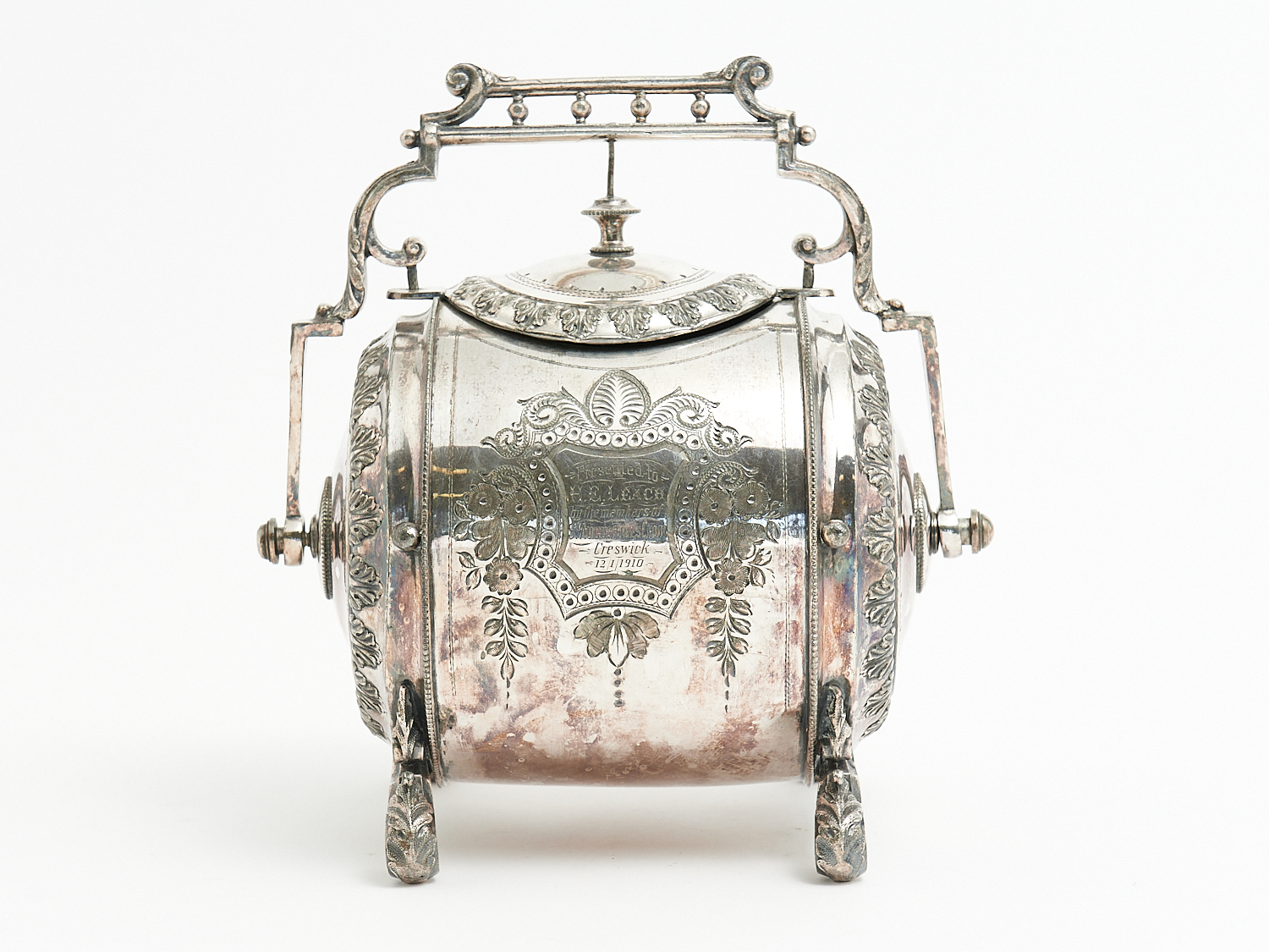 A SILVER PLATED BISCUIT BARRELL H.25.5CM, LEONARD JOEL LOCAL DELIVERY: SMALL