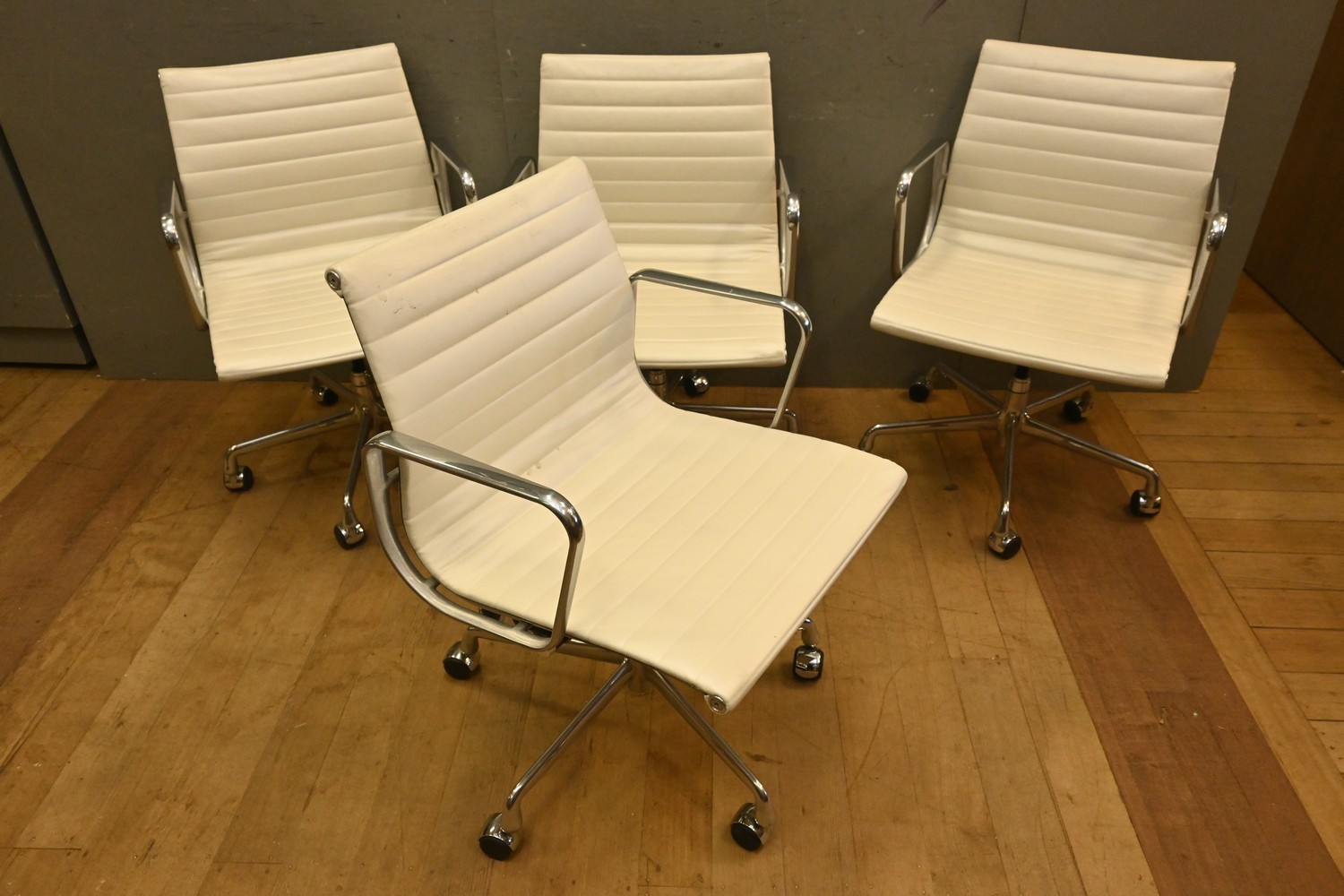 A SET OF FOUR CHARLES AND RAY EAMES 50TH ANNIVERSARY EDITION GROUP CHAIRS FOR HERMAN MILLER (A/F) (90H X 57W X 60D CM) (LEONARD JOEL DELIVERY SIZE: X-LARGE)